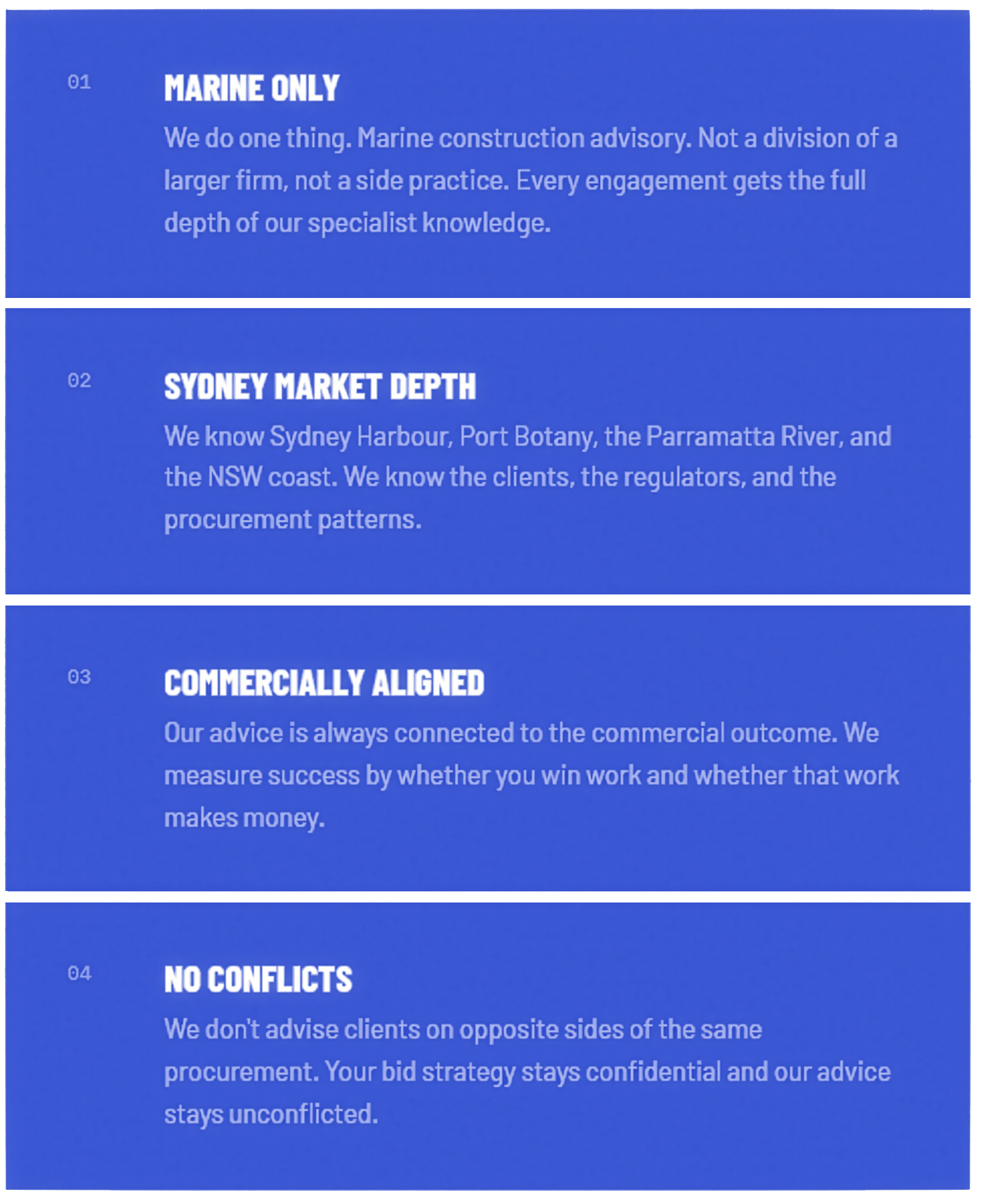 Six advisory disciplines, one goal — giving your business the edge it needs to compete and win in Australia’s marine construction market.