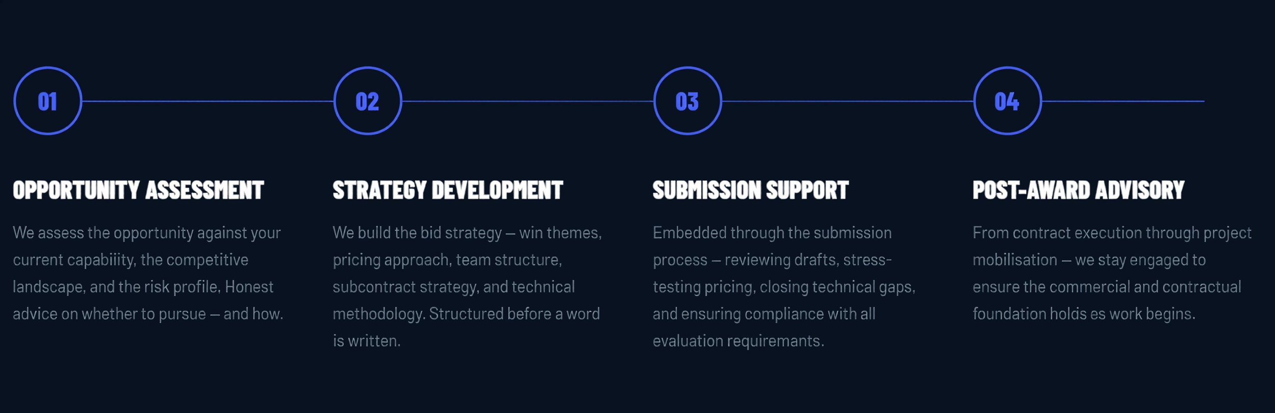 We develop and review your tender submission from first principles — positioning, pricing assumptions, risk allocation, and narrative. We know what evaluators are looking for.