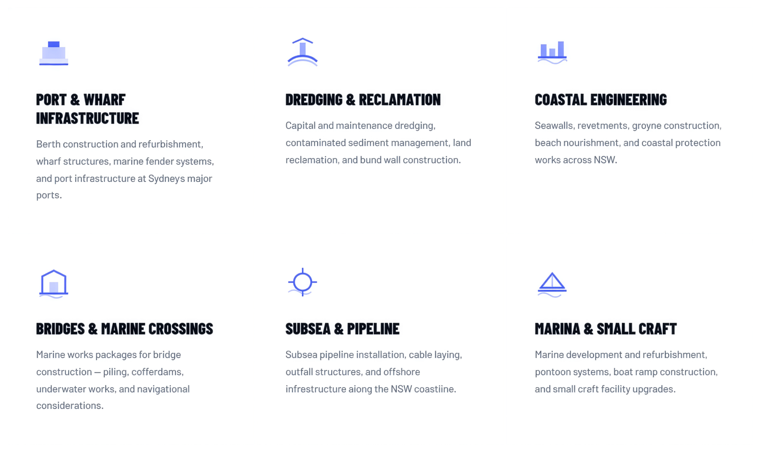 Across all marine construction sectors in Sydney and coastal NSW — from major port infrastructure to coastal protection works.